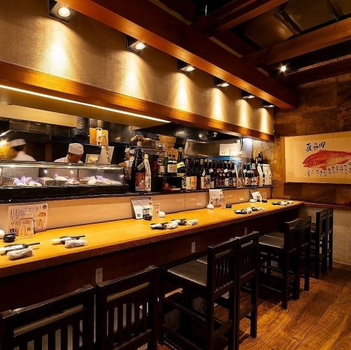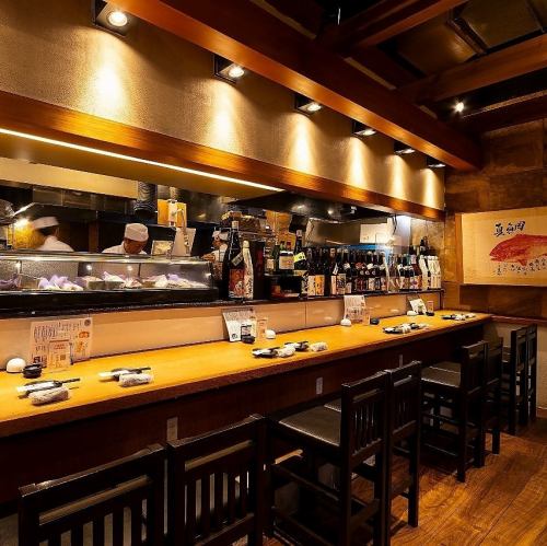 【お一人様やカップルに】少人数でのご利用にぴったりなカウンター席。目の前で繰り広げられる料理人の手捌きを見ながら、お食事とお酒を楽しめます!お仕事帰りの1杯やカップルのデートにも最適です。